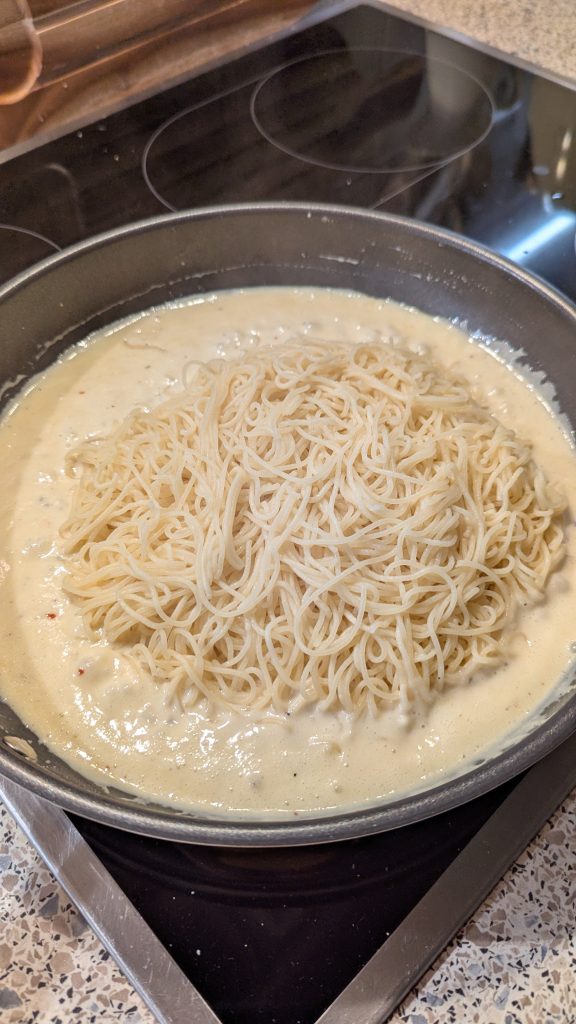 Wenn es zu dickflüssig ist, gib schluckweise etwas Nudelwasser hinzu, bis die Sauce die Pasta perfekt umschließt.