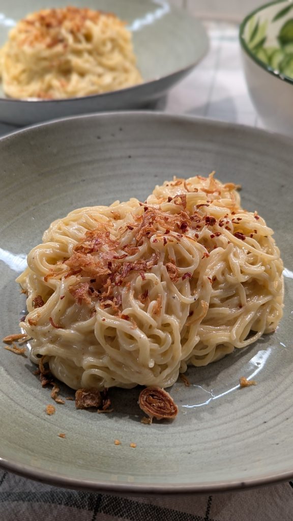 Die Nudeln in reichlich Salzwasser al dente kochen. Wichtig: Behalte eine Tasse vom Nudelwasser zurück!