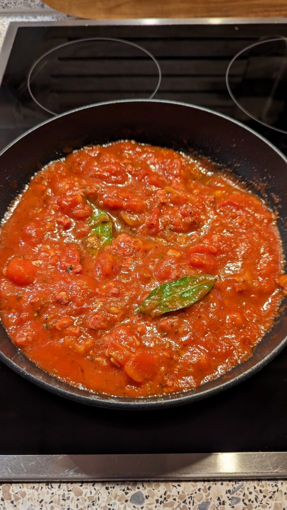 Die Pfanne wieder auf den Herd stellen. Falls noch Füllung übrig ist, diese in der Pfanne lassen und mit dem Inhalt der Tomatendose vermischen. Die getrockneten Kräuter dazu und mit Salz, Pfeffer und etwas Zucker abschmecken. Die Sauce soll nicht zu würzig sein, da die Füllung der Knödel sehr schmackhaft ist. (je nach Wurstsorte)
