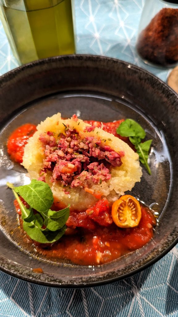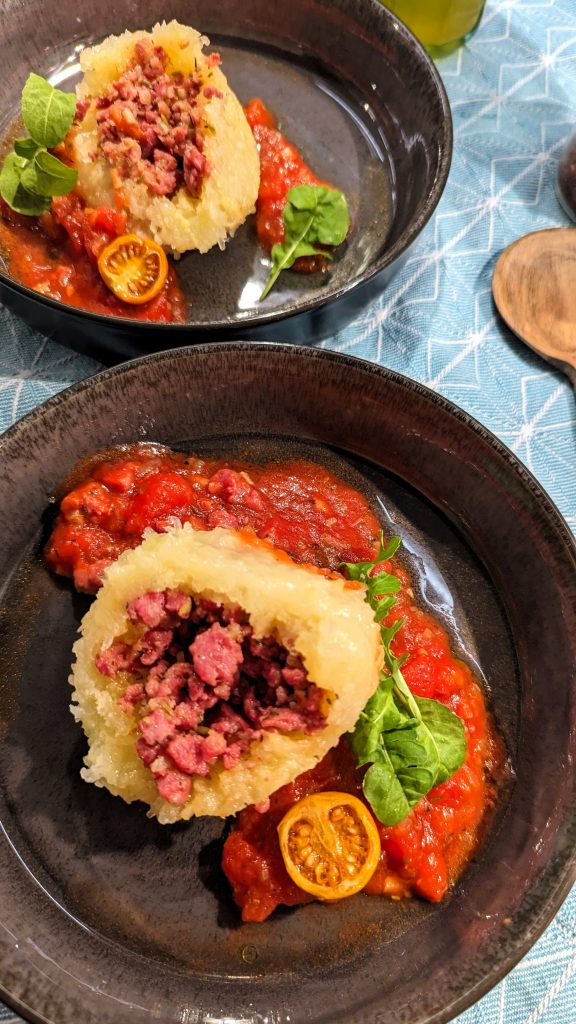 Die fertigen Knödel halbieren und mit Tomatensauce, Ruccola, Basilikum und wer mag mit Parmesansplittern anrichten.
