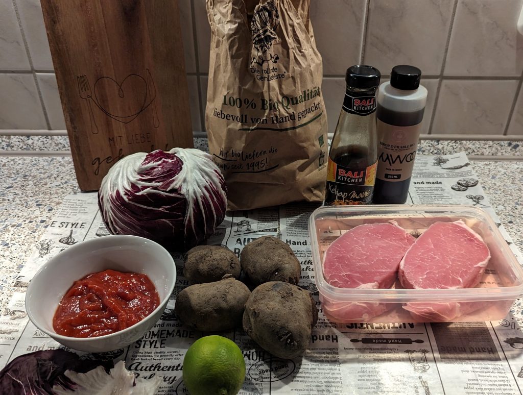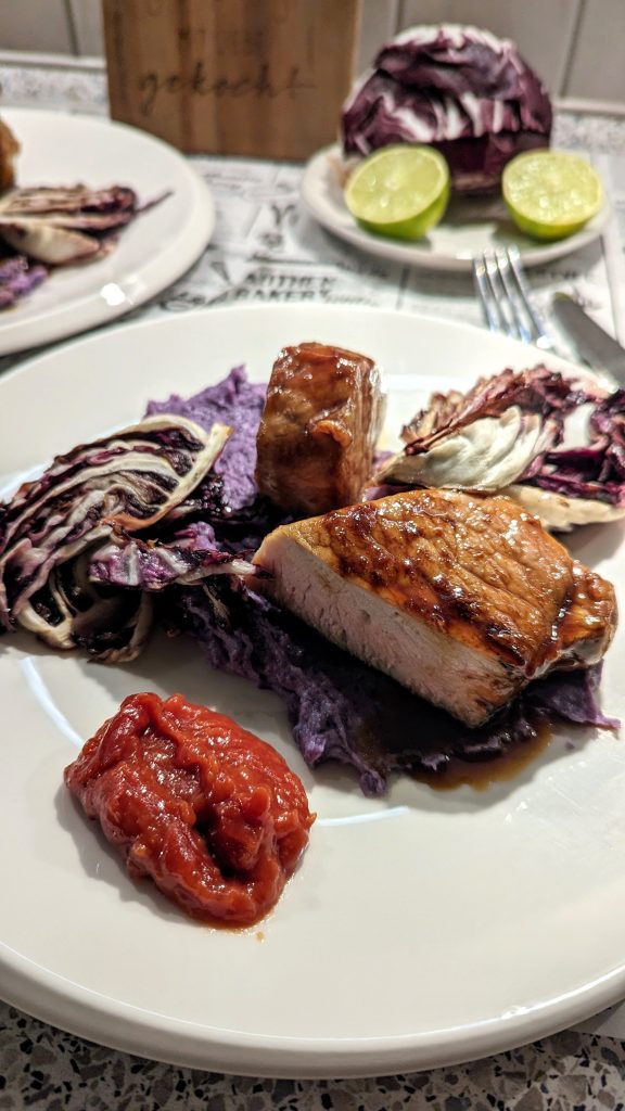Das Ketchup ist der perfekte Begleiter für den Schweinerücken, denn das Bananenaroma hebt das Fleischaroma enorm. Der Ahornsirup mildert die bittere Note des Radicchio ein wenig.