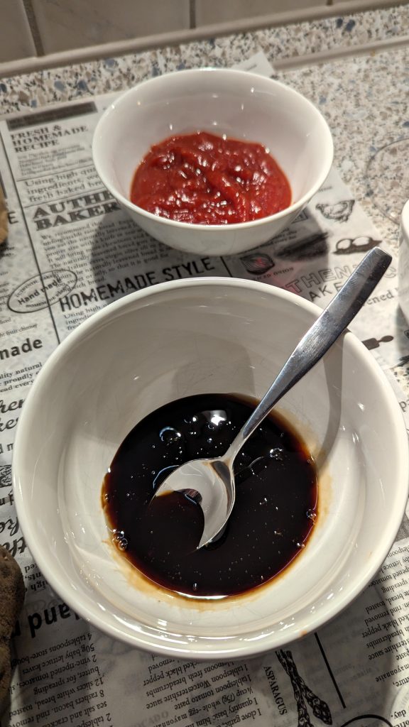 Glasur: Ketjap Manis mit Ahornsirup – für das Fleisch – in einer kleinen Schüssel vermischen.