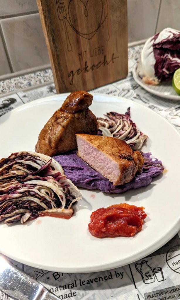 Optional kann in der Zwischenzeit noch nebenbei ein Kartoffelpüree oder Reis, als Beilage zubereitet werden. Das Fleisch aus dem Ofen nehmen und auf Tellern mit Radicchio und Bananenketchup anrichten.