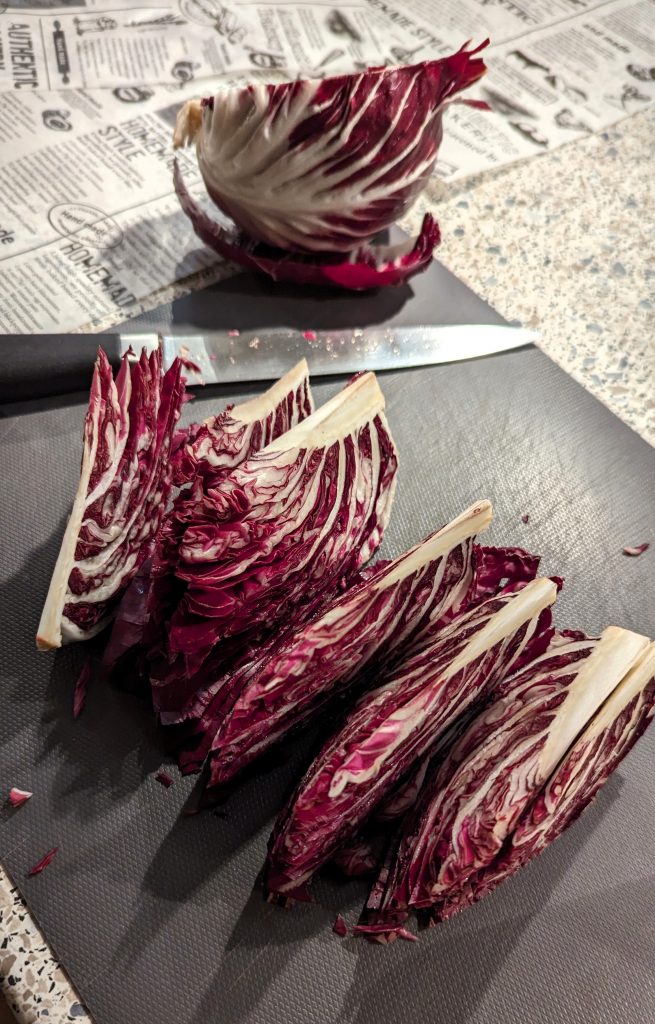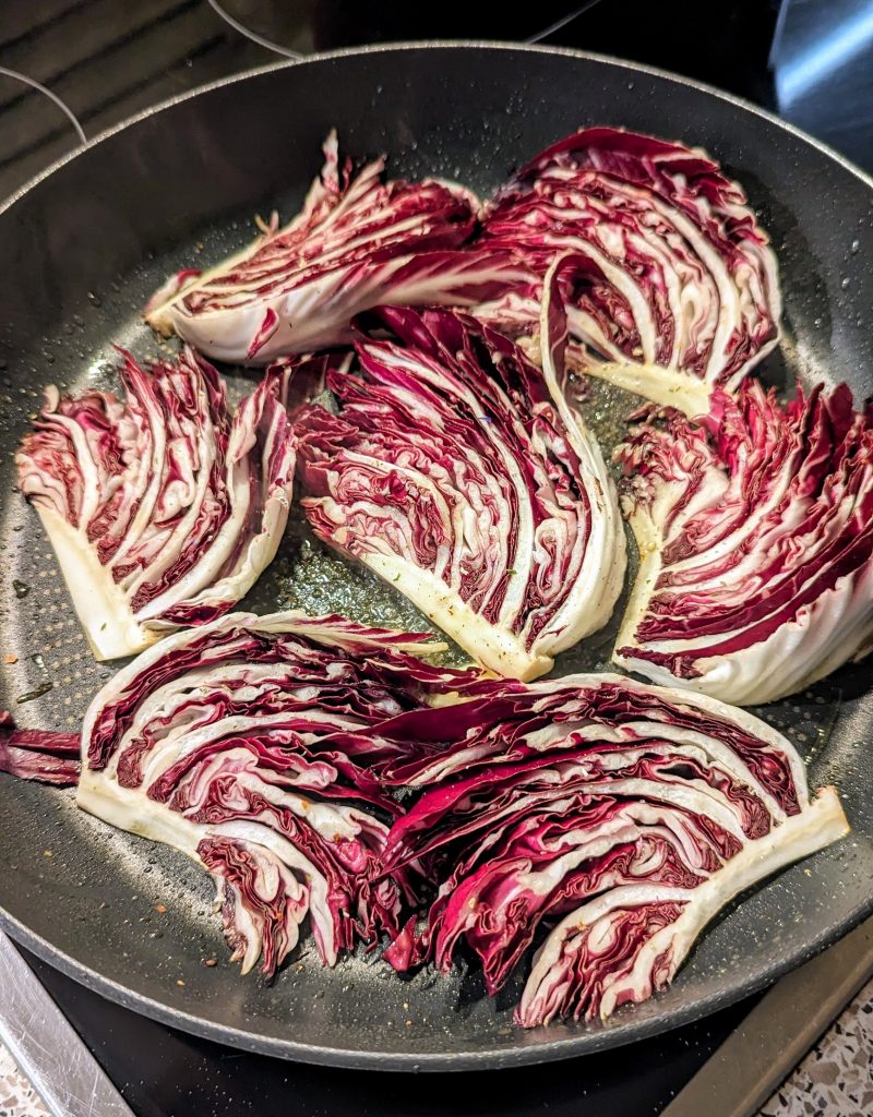 Den Radicchio in Stücke schneiden. Butter in der Pfanne bei mittlerer Hitze zerlassen, Radiccio dazu geben und mit Salz und ein wenig Ahornsirup würzen.