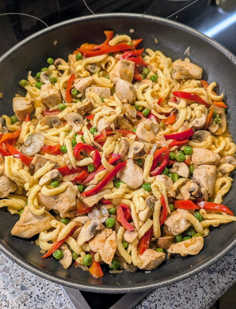Paprika, Erbsen und Paprikapulver dazugeben und kurz mitdünsten. Spätzle in die Pfanne geben und alles zusammen weitere 2-3 Minuten braten.