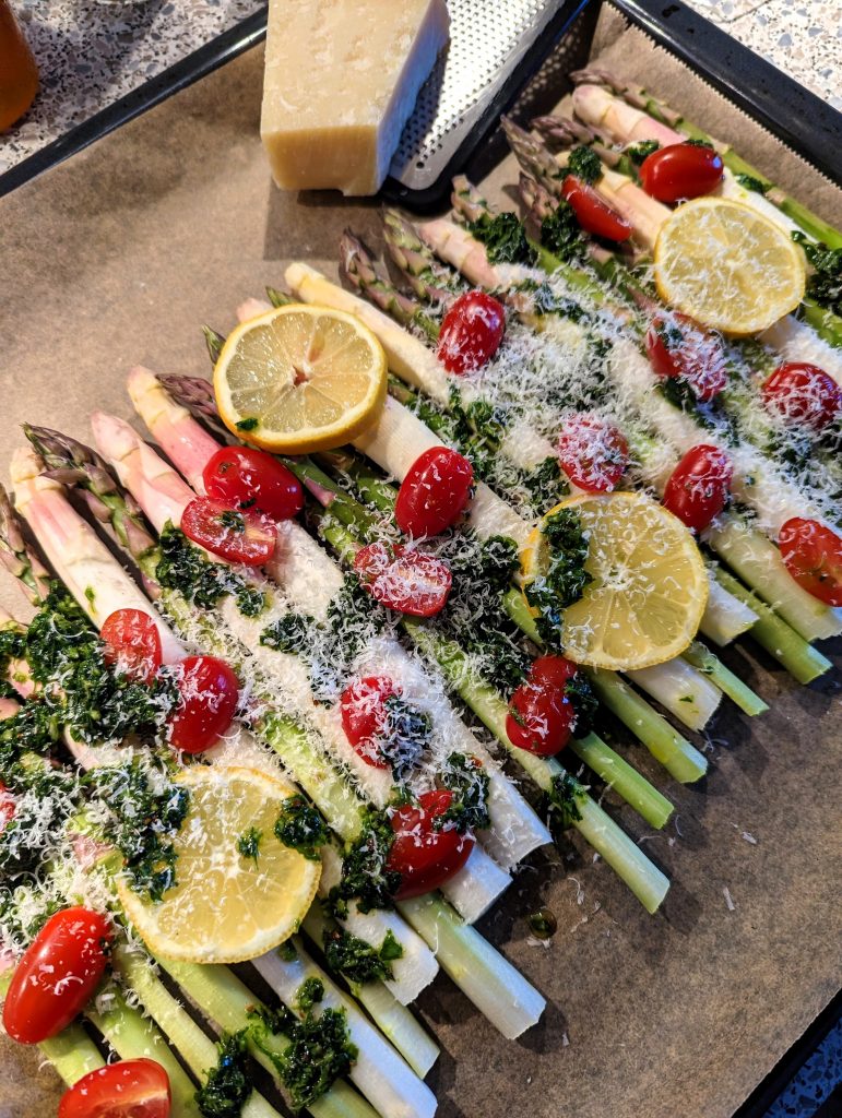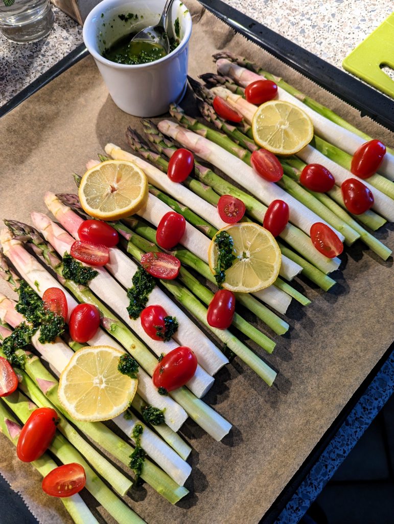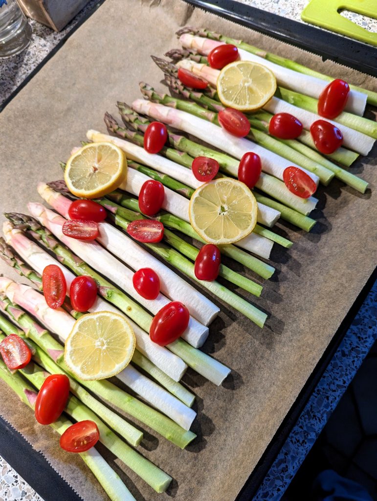 Bei grünem Spargel die holzigen Enden abschneiden, weißen Spargel schälen und auf das Backblech legen. Tomaten halbieren und Zitrone in Scheiben schneiden. Alles auf dem Spargel verteilen.