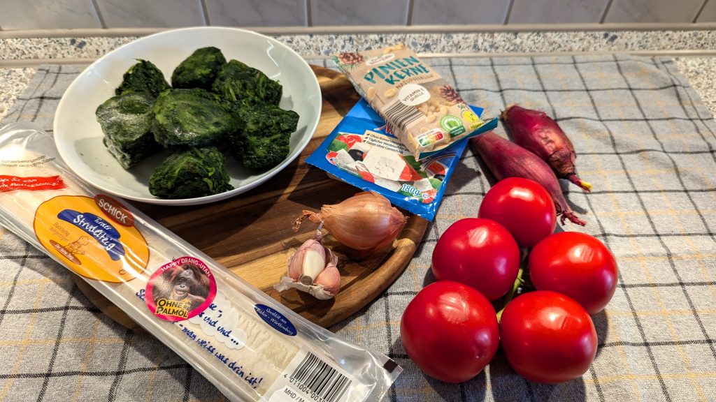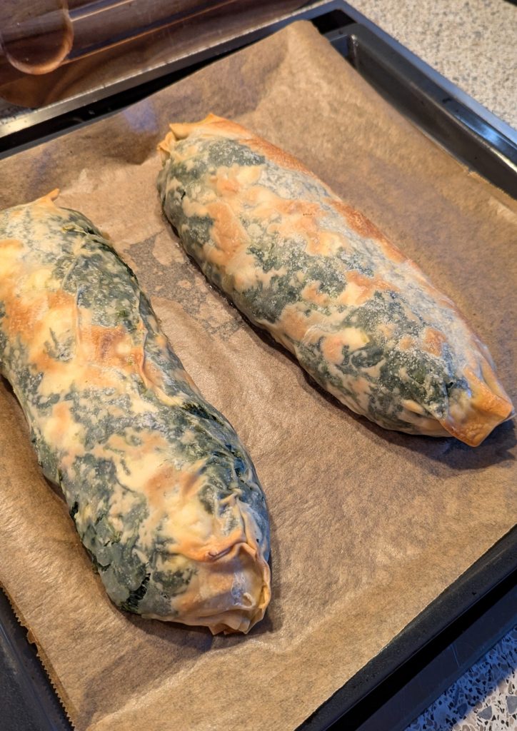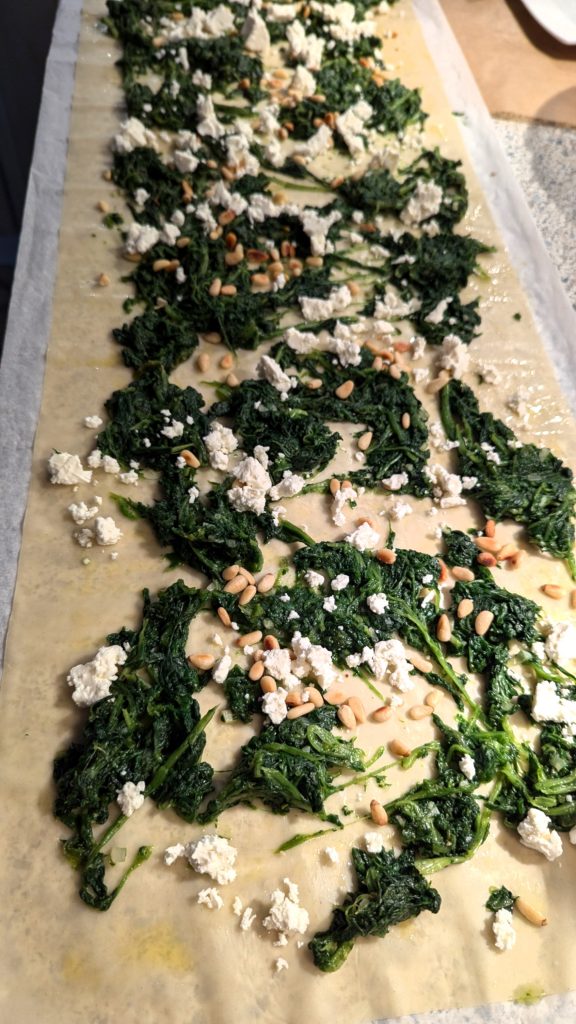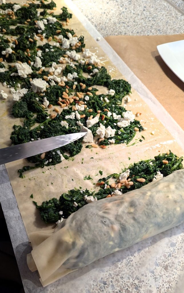 Den Strudelteig auf einem feuchten Küchentuch, oder Backpapier ausrollen und mit Olivenöl bestreichen. Spinat auf dem Teig gleichmäßig verteilen, Feta darüber zerbröseln und die Pinienkerne darüber streuen. Den Strudel mit Hilfe des Backpapiers aufrollen.