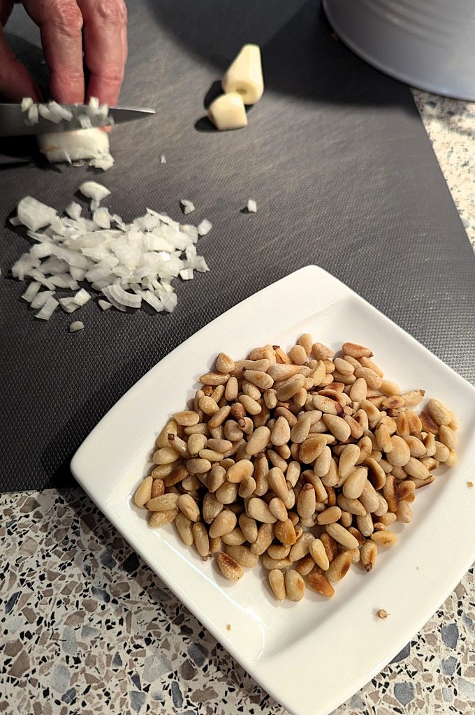 Schalotte und Knoblauch schälen und fein würfeln. Pinienkerne in einer Pfanne ohne Fett goldbraun rösten und beiseite stellen. 2 EL Öl in die Pfanne geben und darin die Schalotte und den Knoblauch leicht andünsten.