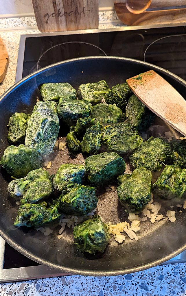 Den Spinat dazu geben und alles zusammen ca. 5 Minuten dünsten, bis die Flüssigkeit weg ist. Alles kräftig mit Salz, Pfeffer und frisch geriebener Muskatnuss würzen.