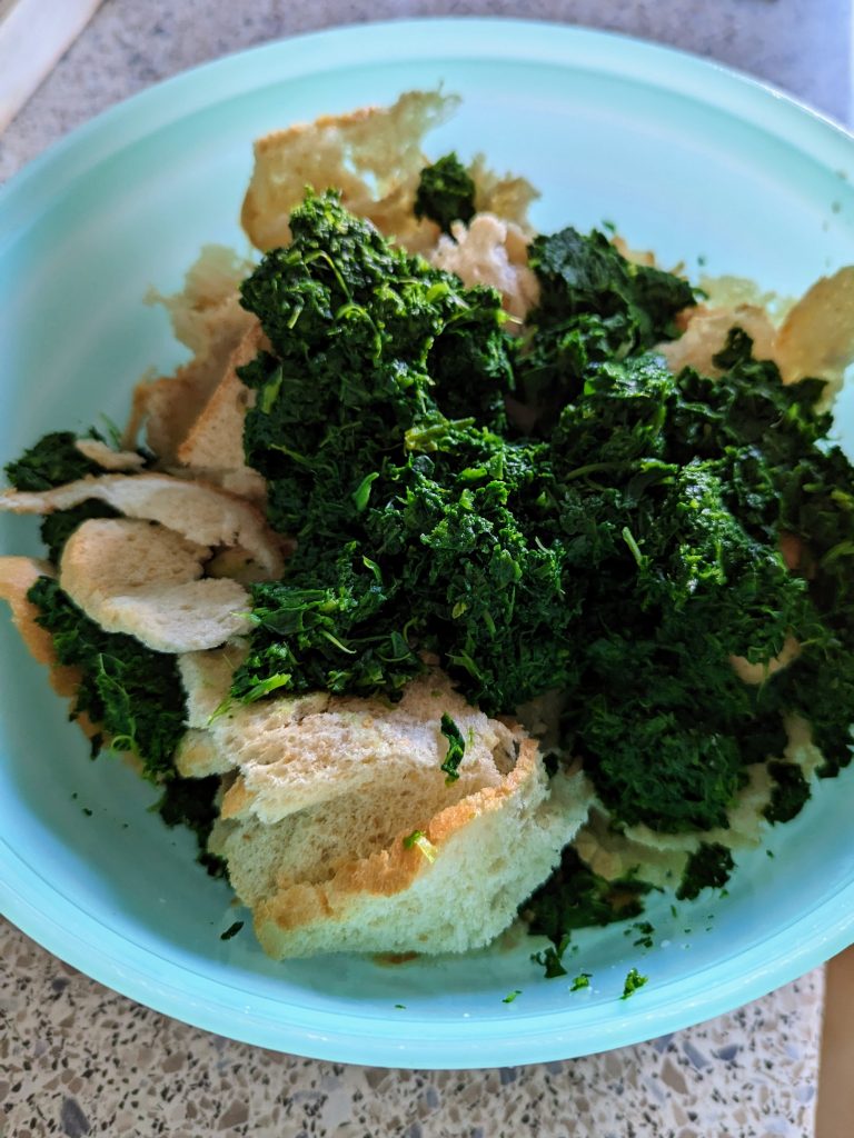 Den gewaschenen Spinat in kochendem Wasser kurz blanchieren und danach gut abtropfen lassen. Anschließend sehr klein schneiden. Zwiebel schälen, klein würfeln und mit der Butter in einem Topf kurz glasig dünsten. Spinat mit Ei, Semmelwürfel, Milch, Salz, Pfeffer, Muskat und Zwiebeln vermengen und etwas ziehen lassen.