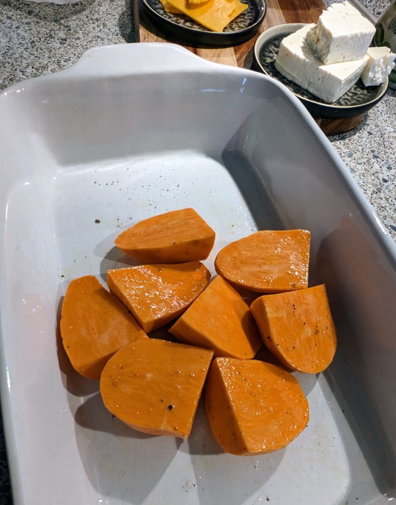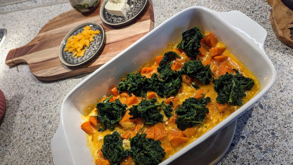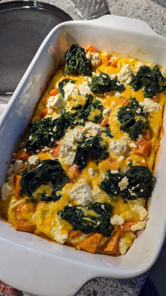 Die weichen (vorher testen) Süßkartoffeln in der heissen Auflaufform zerkleinern und die Eiermischung darüber verteilen. Spinat darauf geben und mit dem restlichen Feta und Cheddar bestreuen.