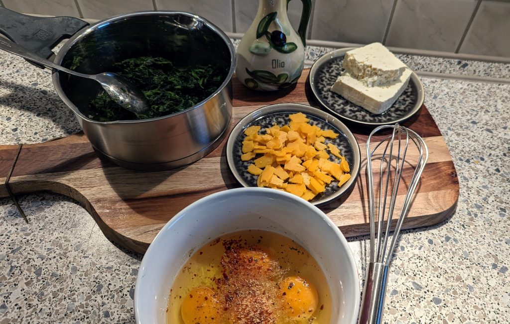 Eier mit reichlich Muskatnuss, Salz, Pfeffer und Chili verquirlen. Die Hälfte des Cheddar und die Hälfte des Feta zerbröselt dazu mischen.
