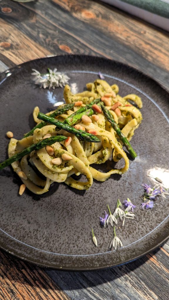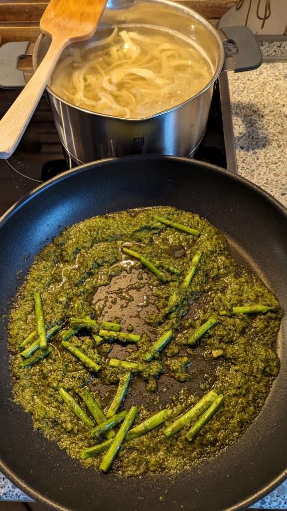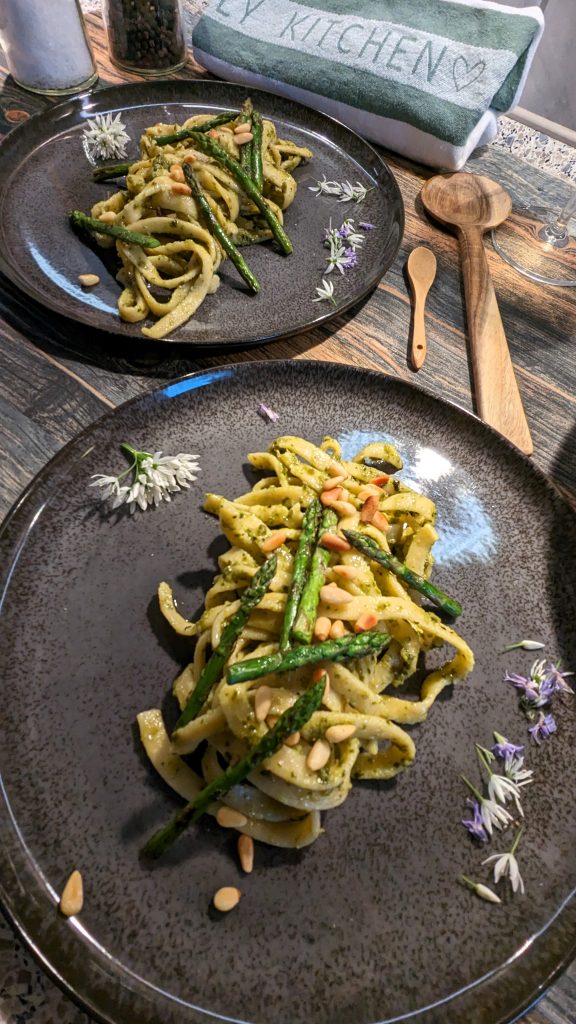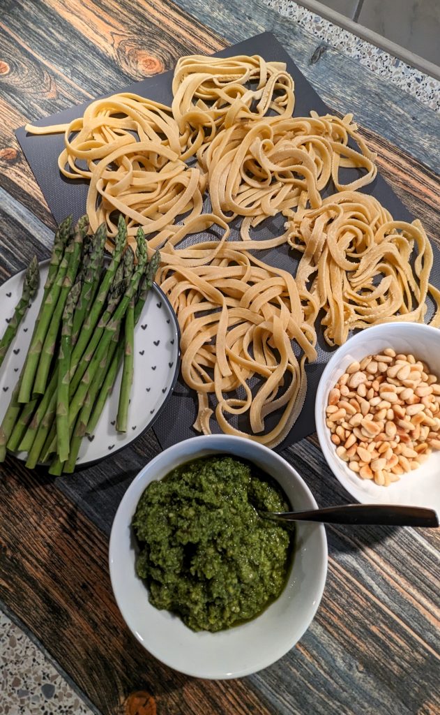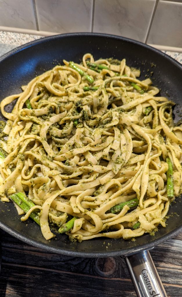 Die Pinienkerne für die Pasta in einer Pfanne ohne Öl rösten und beiseitestellen. Spargel von den holzigen Enden befreien und in Mundgerechte Stücke schneiden. Den Spargel in die Pfanne geben und darin kurz anbraten. Je nach Belieben länger, oder kürzer. Das Pesto dazu geben und mit dem Spargel zusammen mischen. Die Tagliatelle aus dem Wasser dazu geben. Es darf noch etwas Nudelwasser zugefügt werden.