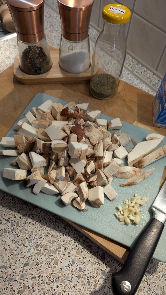 Steinpilze putzen und in mundgerechte Stücke schneiden. Knoblauch schälen und fein hacken. Petersilie waschen, trocken schütteln und fein hacken.