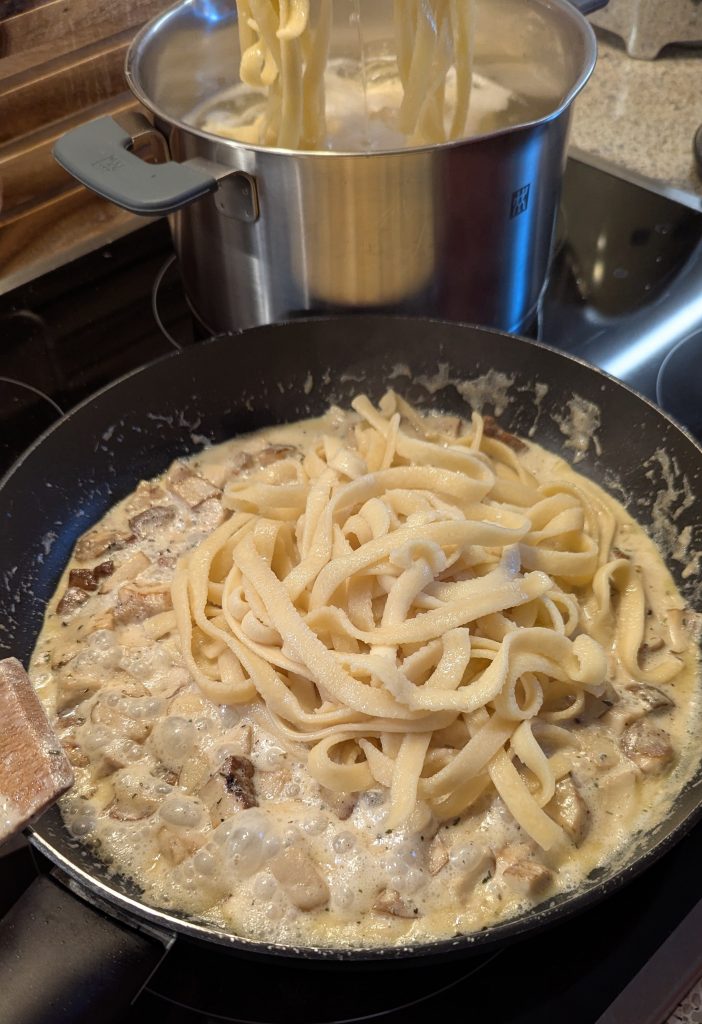 Die gekochten und heissen Tagliatelle direkt zur Steinpilzsauce in die Pfanne geben. Alles gut vermischen, bis die Nudeln die Sauce aufgenommen haben. Falls die Sauce zu dick ist, ein bis zwei Esslöffel vom Nudelwasser hinzufügen.