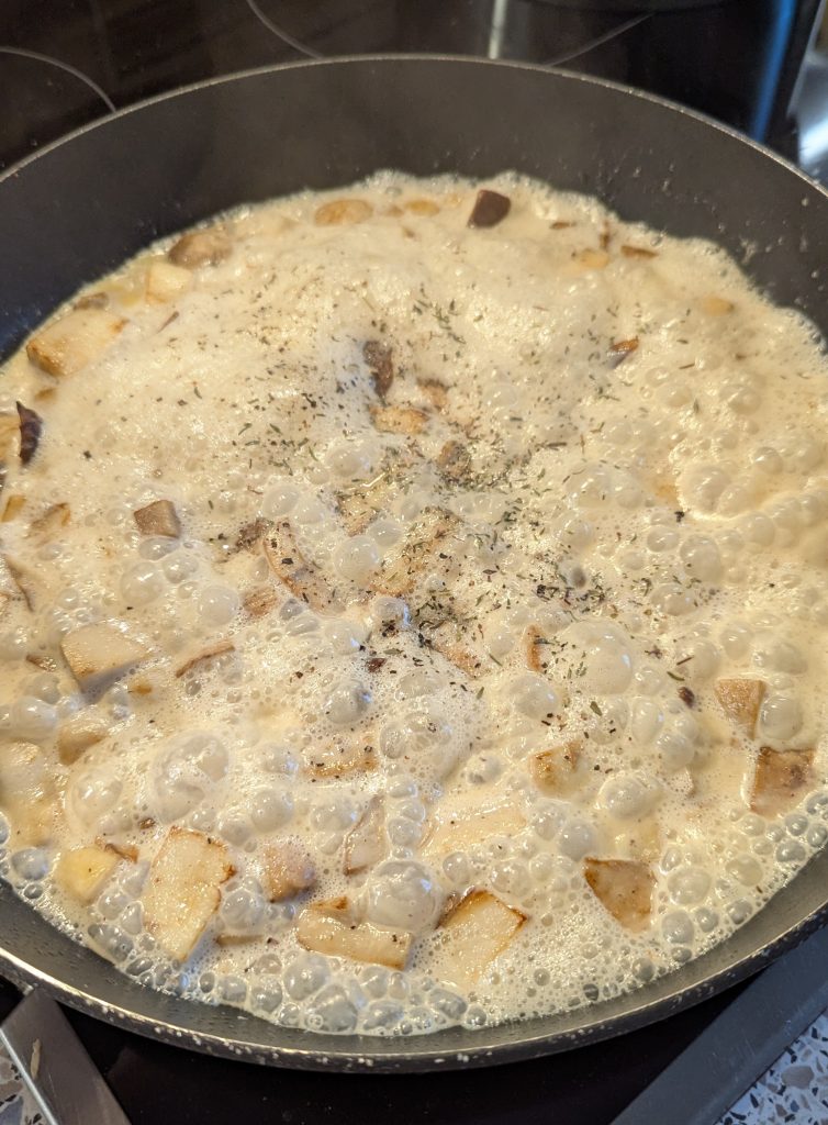 Sahne dazu geben, alles gut umrühren mit Salz, Pfeffer und Thymian würzen und kurz aufkochen lassen. Die Hitze reduzieren und ca. 5 Minuten köcheln, bis die Sauce leicht andickt.