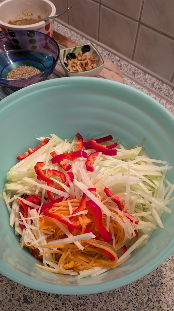Das „Som Tam“ Geheimnis: Gib die Kohlrabi- und Karottenstifte zusammen mit den Tomaten und Paprika in eine große Schüssel. Giesse das Dressing darüber und „massiere“ es mit den Händen, oder stoße das Gemüse leicht mit einem Löffel (oder Mörserstößel), damit die Fasern aufbrechen und das Dressing aufnehmen können.