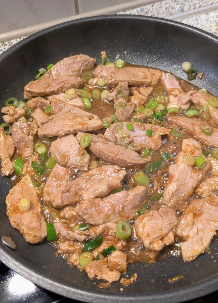Sesamöl in einer Pfanne erhitzen. Die Filetstreifen 2-3 Minuten scharf darin anbraten, bis sie gar, aber innen noch etwas rosa sind. Marinade angießen. Frühlingszwiebel hinzufügen und mit dem Fleisch vermengen. Kurz ziehen lassen und beiseite stellen.