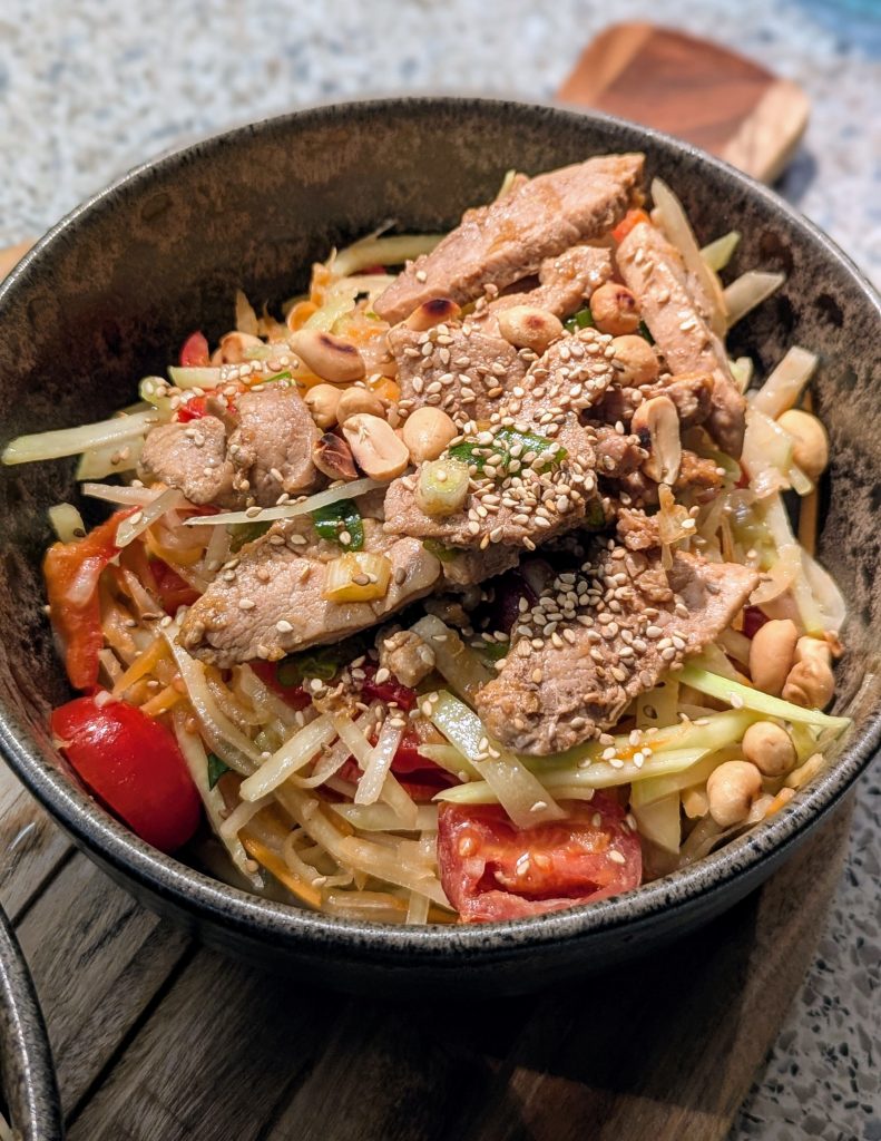 Der Clou: Kohlrabi besitzt eine ähnliche Textur wie grüne Papaya, bringt aber eine ganz eigene, dezente Süße mit. In Kombination mit farbenfrohen Karotten und kurz gebratenem, saftigem Schweinefilet wird aus dem leichten Salat eine vollwertige, proteinreiche Mahlzeit – perfekt für einen Clean-Eating-Lunch oder ein leichtes Abendessen.