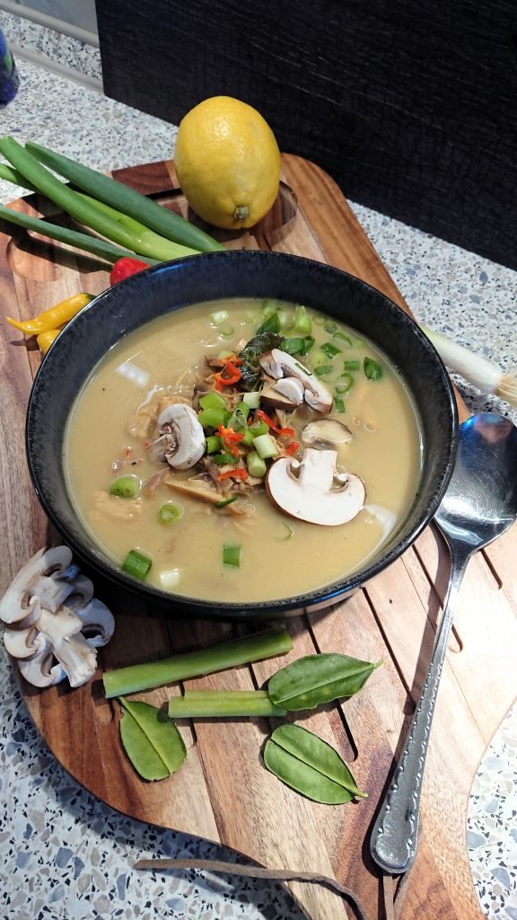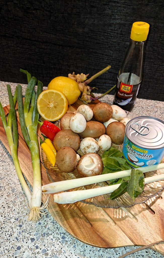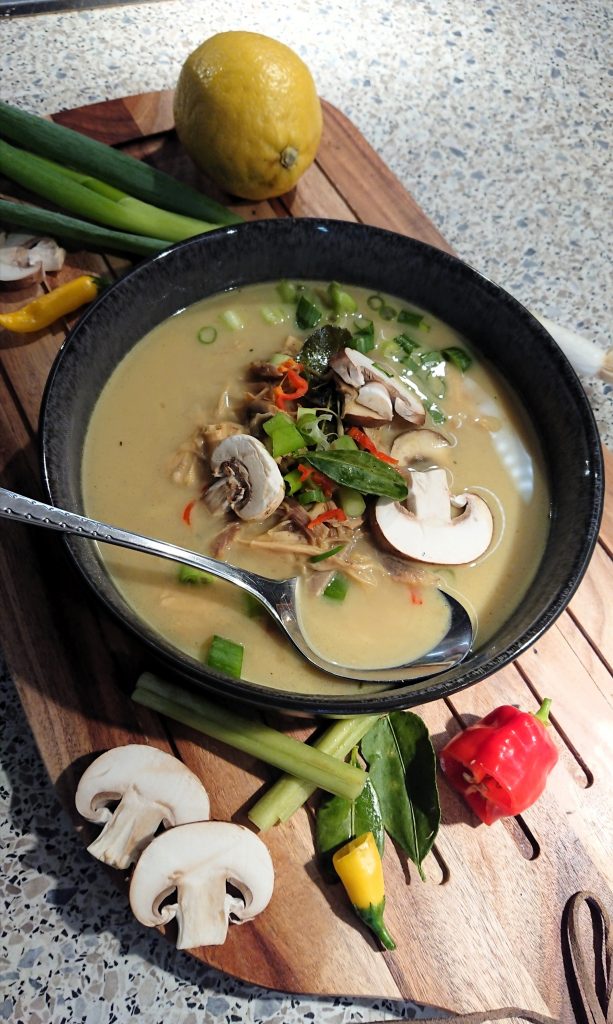 Ingwer und Chili fein schneiden. In einem Topf das Öl erhitzen. Currypaste in den Topf und kurz anbraten, Chili und Ingwer darunter mischen. Mit Geflügelfond, Sojasauce und Fischsauce aufgießen. Das Zitronengras andrücken (am besten klappt das mit einem Fleischklopfer, oder der Messerseite, damit die Fasern leicht aufbrechen) und zusammen mit den Limettenblättern in die Suppe geben. 10 Minuten köcheln lassen. In der Zwischenzeit die Champignons putzen und in feine Scheiben schneiden. Hähnchenfleisch in mundgerechte Stücke schneiden. Wir verwenden meist das Fleisch vom Suppenhuhn – als Alternative Hähnchenbrust.