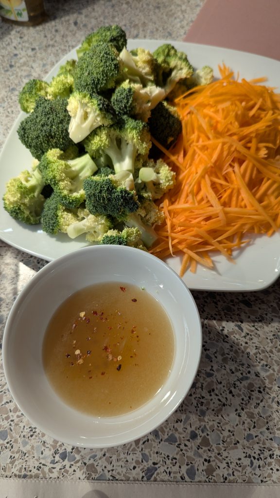 Du kannst den Brokkoli und Spinat auch zusammen mit den Karotten und dem Tofu in einem Wok mit etwas Knoblauch, Sojasauce und einem Schuss Reisessig anbraten und dies über die Reisnudeln geben.