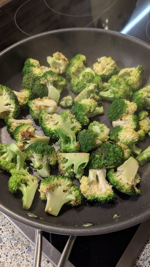 Den Brokkoli in die Pfanne geben, kurz anbraten und mit 2-3 EL Wasser bei geschlossenem Deckel ca. 3-4 Minuten dämpfen. (Alternativ in kochendem Wasser blanchieren, bis er noch leicht knackig ist.) Aus der Pfanne nehmen.