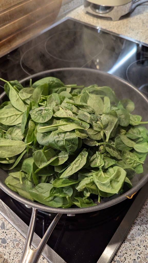 1TL Sesamöl In der Pfanne erhitzen. Den Spinat kurz darin schwenken, bis er gerade zusammenfällt. Mit einer Prise Salz würzen.