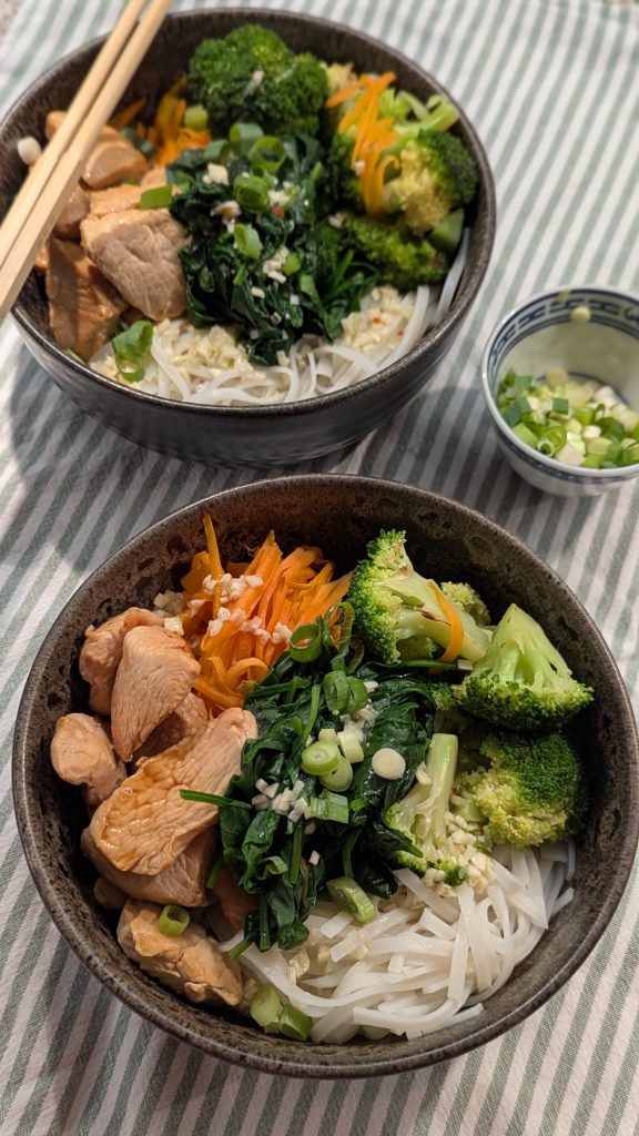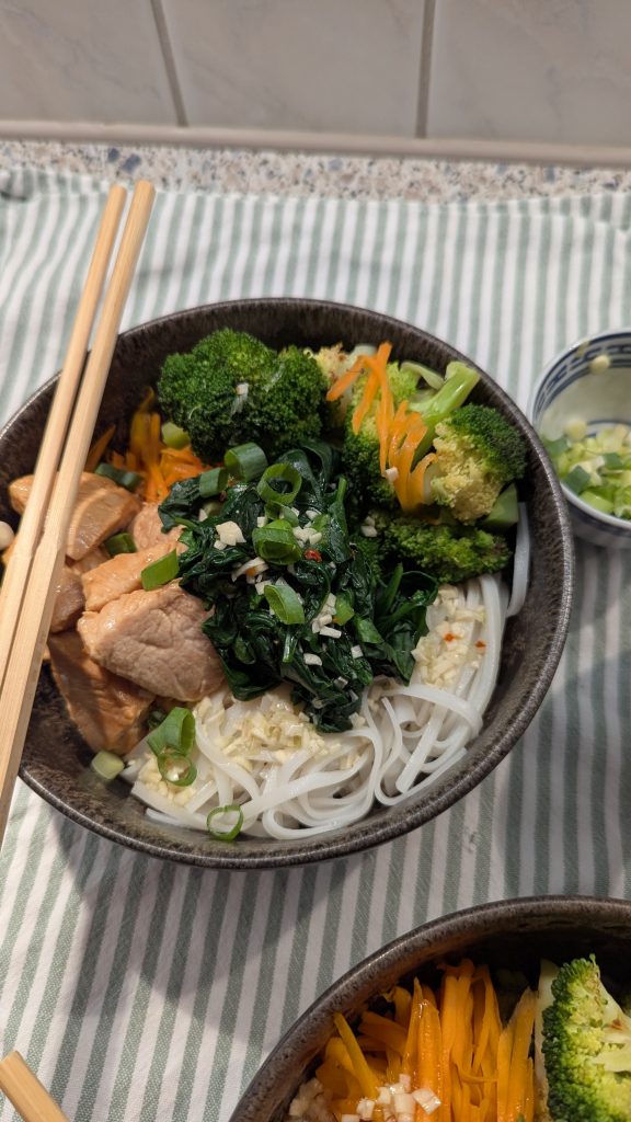 In dieser Variante bringen wir zwei heimische Gemüse-Stars ins Spiel: knackigen Brokkoli und zarten Spinat. Sie werden kurz gegart, um ihre Vitamine und ihren Biss zu behalten, und ergänzen das Hühnchen oder den Tofu, sowie die Fülle an frischen Kräutern ideal.