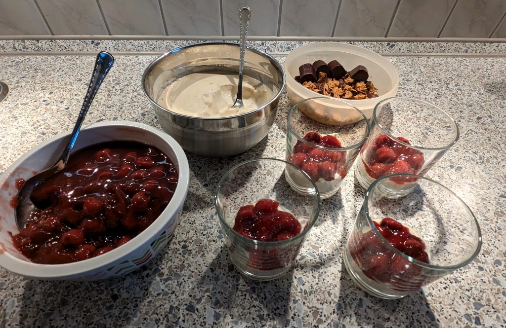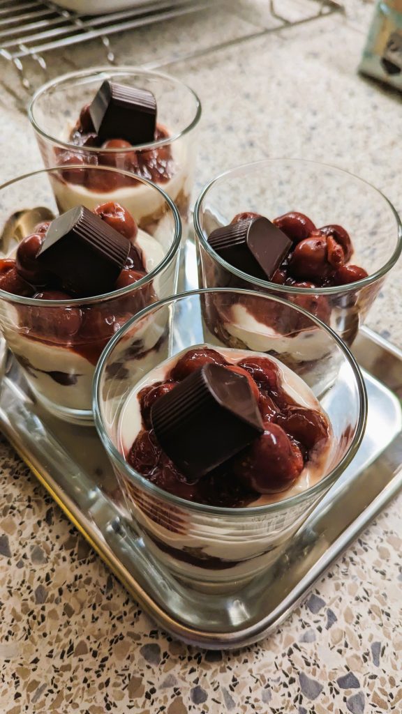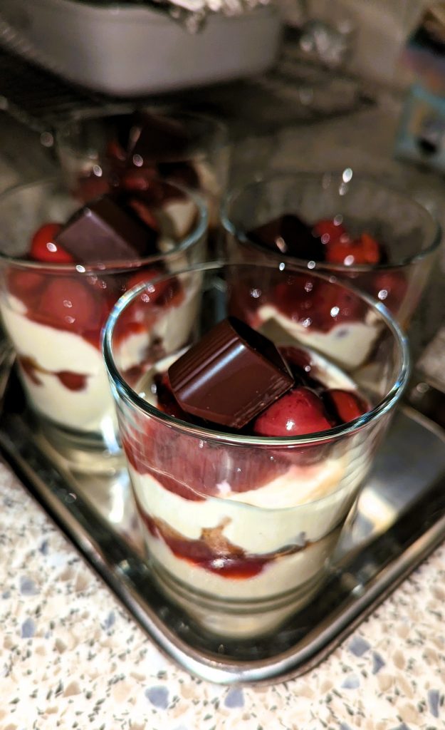 Abwechselnd in Gläser einschichten. Zufällig hatte ich die neuen Mon Cherie mit Punschkirschen entdeckt und diese noch oben drauf gelegt.